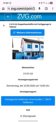 Termin zur Zwangsversteigerung am Donnerstag 23.04.2026 um 14 Uhr Raum 6 Sitzungsaal Amtsgericht 74074 Heilbronn Knorrstrasse 1
